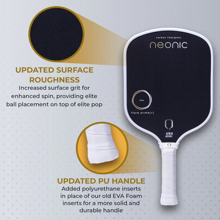 Introducing the Neonic Flare Prime X – High Power and Pop | Lightweight | Enhanced Sweet Spot. The Flare Prime X is best suited for players looking to add a controllable amount of power and pop to their game. Find other paddles a little too heavy? No problem. The Flare Prime X comes in at just 7.8 ounces and a 107 swing weight – giving you the ability to swing and flick with ease. Miss the sweet spot a lot? Or do you find the ball dying off your paddle often? Enter the Flare Prime X – with an enhanced sweet spot from its foam-injected edges and a denser 6mm cell size, you can play with full confidence.